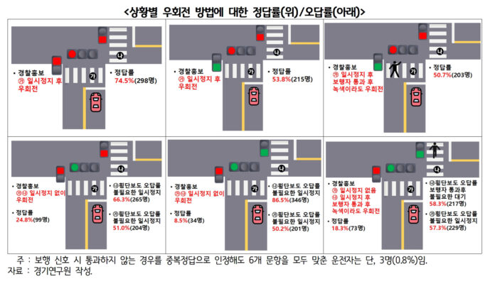 경기연구원은 2023년 12월 21일 수도권 시민 600명(운전자 400명, 보행자 200명)을 대상으로 우회전 통행방법 관련 인식조사를 실시한 ‘우회전, 돌아야 되나 말아야 되나?’ 보고서를 발간했다고 6일 밝혔다.
