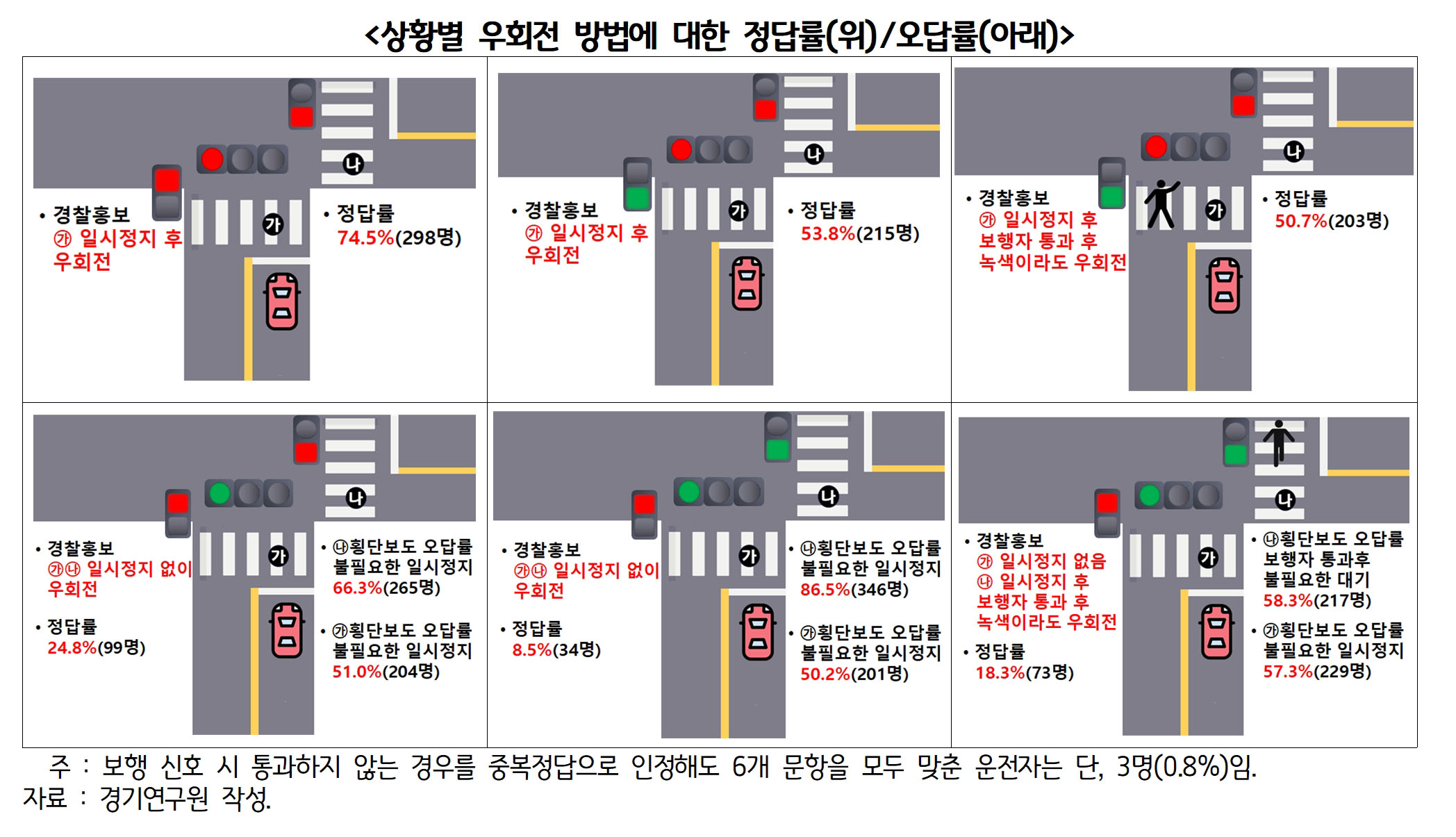 하지만 설문조사에서 경찰청 홍보물을 기준으로 법적으로 올바른 우회전 통행방법에 대한 테스트를 시행한 결과, 우회전 방법에 대해 정확히 인지하고 있는 운전자는 400명 중 1명에 불과하였다. 대부분의 운전자들이 서로 잘못된 통행방법으로 우회전을 하다 보니 운전자 간 다툼 등 사회적 혼란만 발생하고 제대로 된 제도 개선 효과를 기대하기 어려운 상황인 것을 알 수 있다.