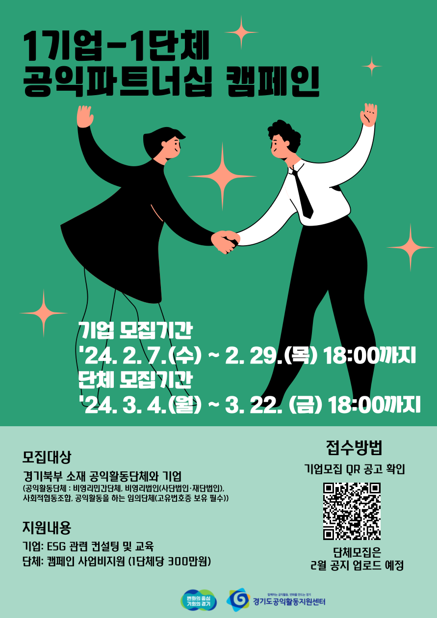 경기도공익활동지원센터가 경기북부 기업과 공익활동단체가 함께 지역 사회문제 해결 방안을 모색하는 ‘1기업-1단체 공익파트너십 캠페인’의 참여기업을 오는 29일까지 모집한다.