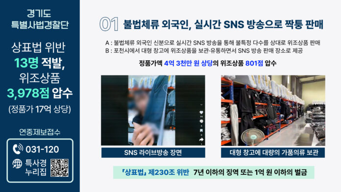인적이 드문 외진 곳에 위치한 매장에서 가짜명품을 판매한 불법체류자 신분의 외국인과 짝퉁을 대량으로 보관·유통하는 대형 창고 운영자 등 상표법을 위반한 13명이 경기도 특별사 법경찰단에 검거됐다.