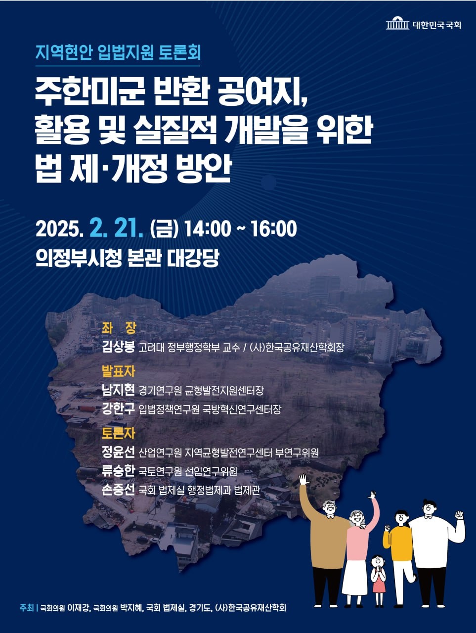 토론회는 김상봉 고려대 정부행정학부 교수가 좌장을, 남지현 경기연구원 균형발전지원센터장, 강한구 입법정책연구원 국방혁신연구센터장이 각각 ‘반환공여구역 현황 및 제도적 개선방안’, ‘주한미군 반환구역의 활용 실태와 문제 극복 방안의 모색’과 관련해 발표자료 참여한다. 또 정윤선 산업연구원 박사, 류승한 국토연구원 선임연구위원, 손중석 국회 법제실 법제관이 토론자로 참석할 예정이다.